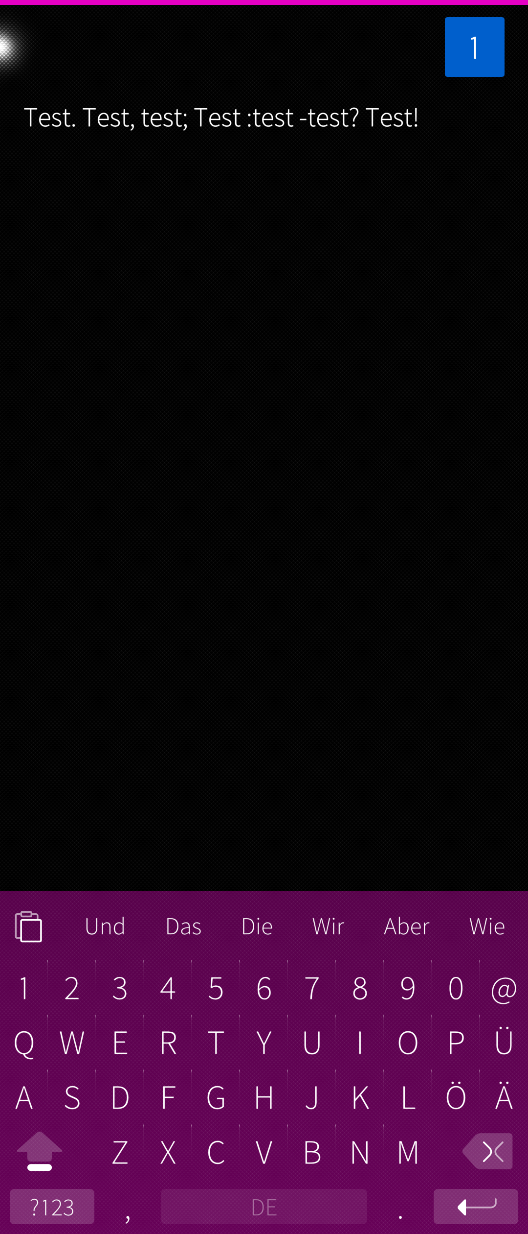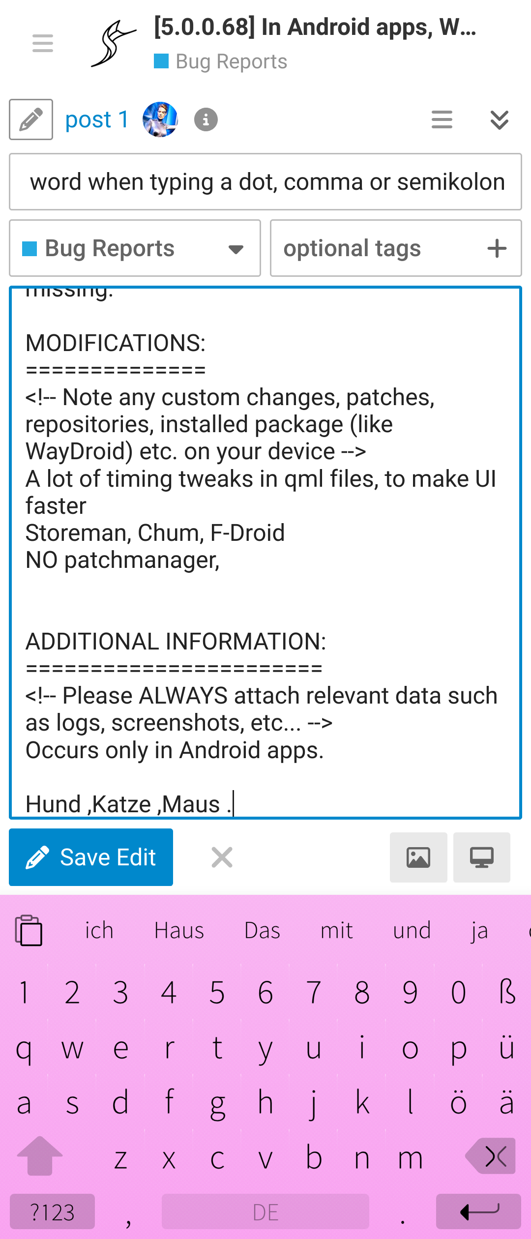 When typing text in Android app, e.g. Delta Chat, K-9 Mail, , if the last word is from a word suggestion, then entering a dot or a comma or semikolon, the space after the last suggested word is not removed. So between the last word and the dot, comma or semicolon remains a space. To continue writing, the space between the punctuation and the next word has to be typed by user.
