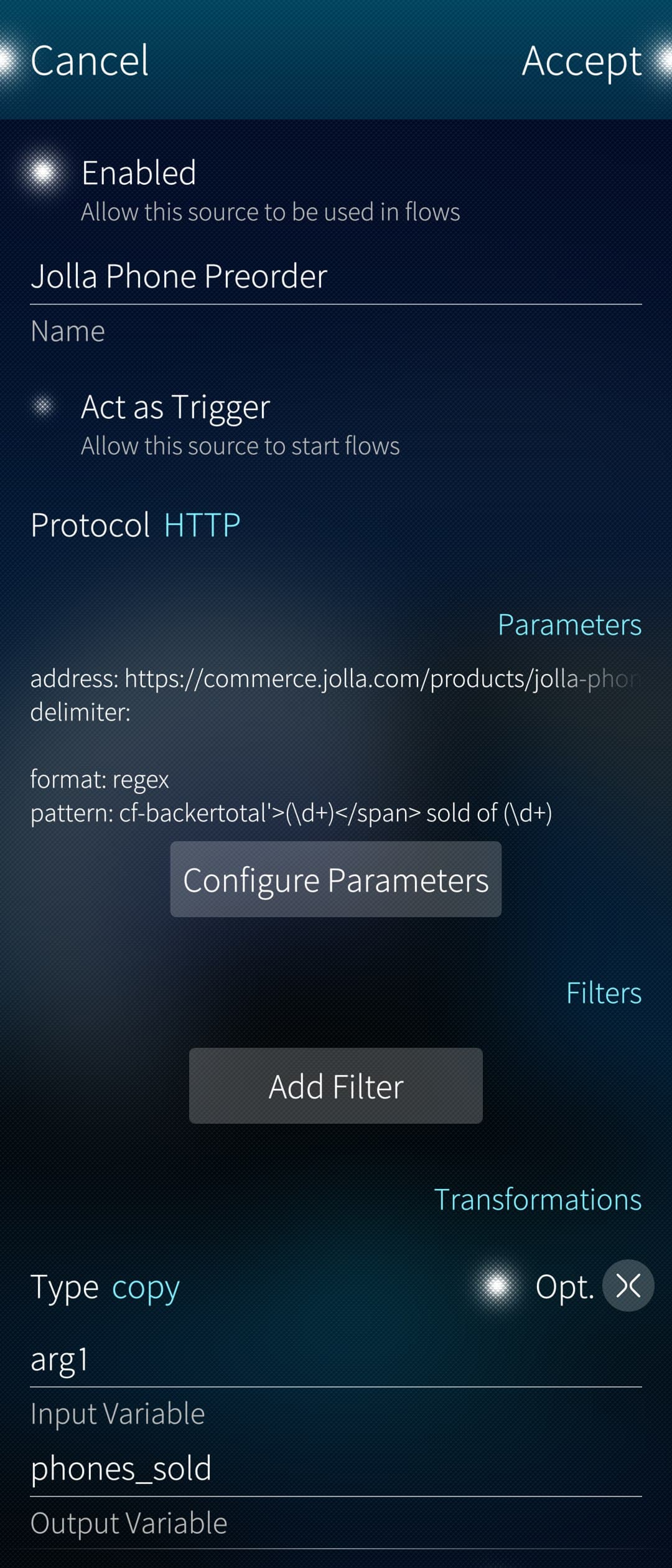 The difference between sources and triggers is that triggers can act as both, but can actually be used to start a flow. For example, a D-Bus signal can be a trigger, whereas a D-Bus method call can only be a source.