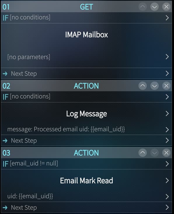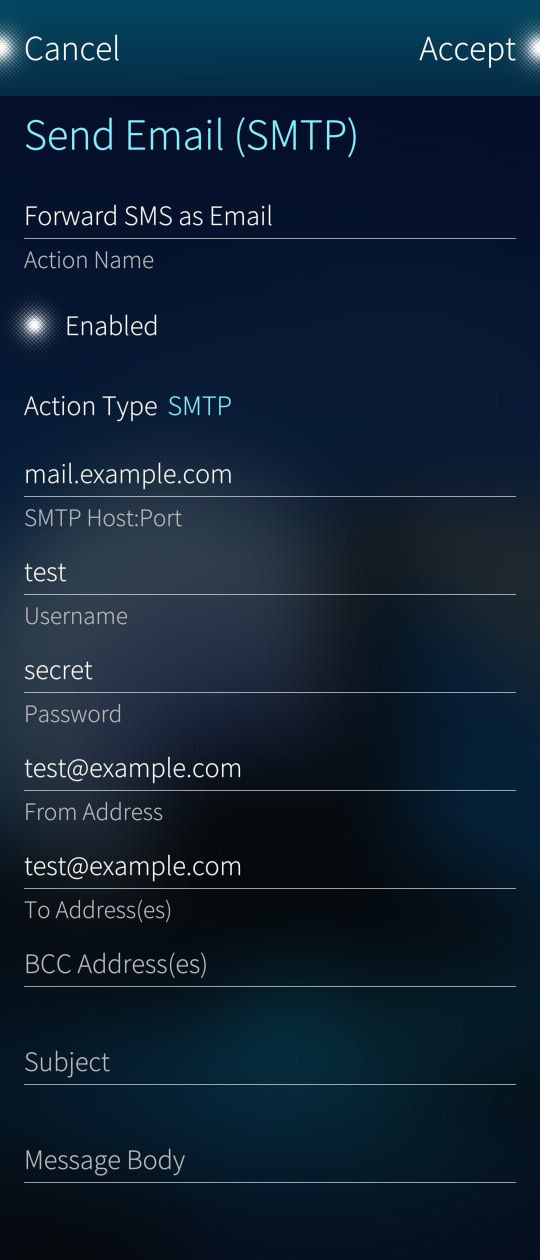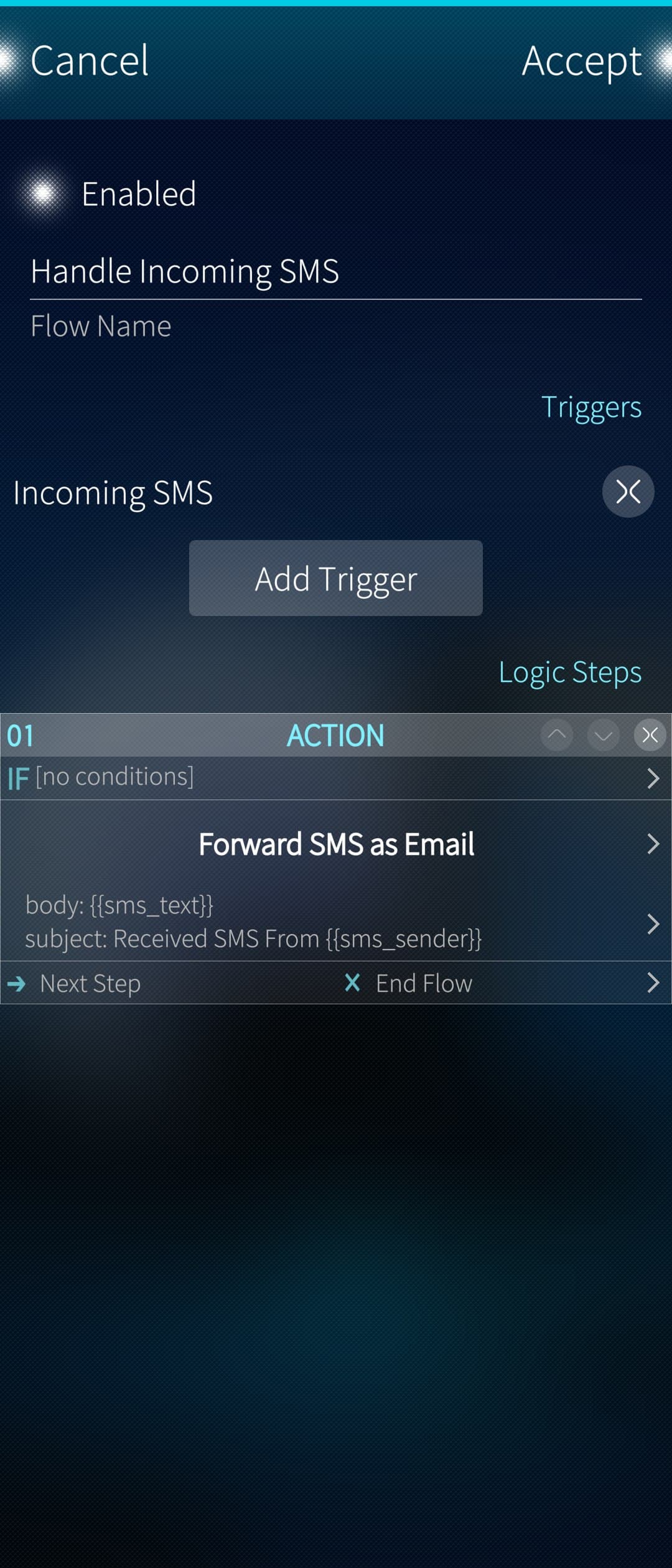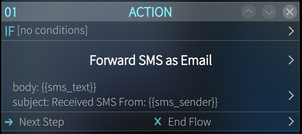 In this example the trigger receives a text message and saves the sender number and the actual text into two variables: sms_sender and sms_text.