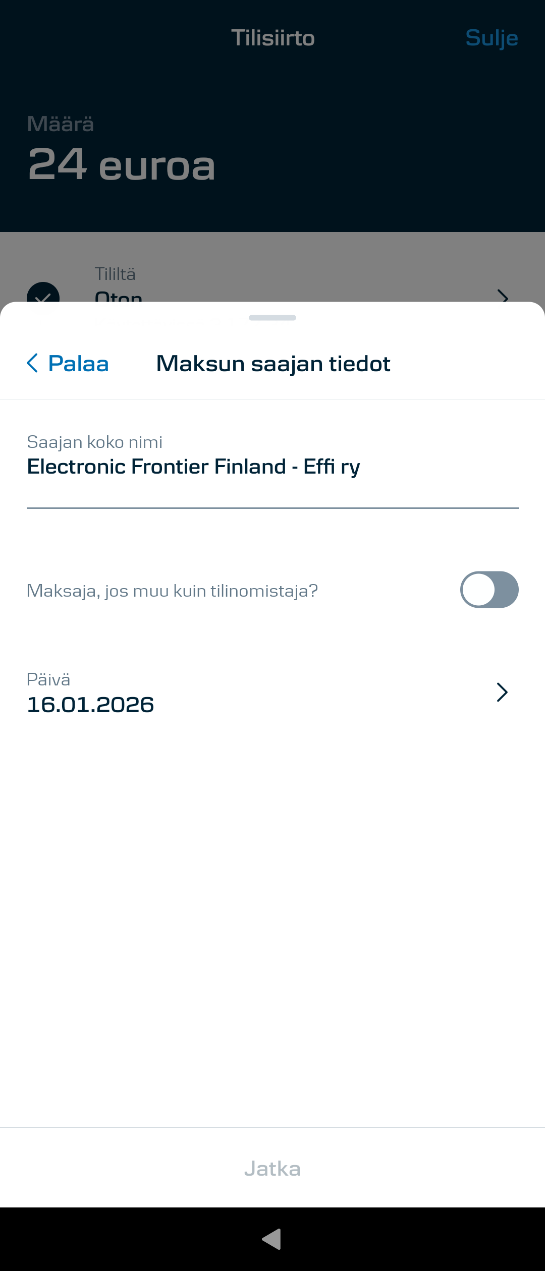 I’ve earlier reported the Danske Bank mobile app as working, but today I noticed a thing: if you try to bring in a “virtual barcode” via copy-paste it never goes through. The “Continue” (“Jatka” in Finnish) button stubbornly stays grey, even though everything is correct.