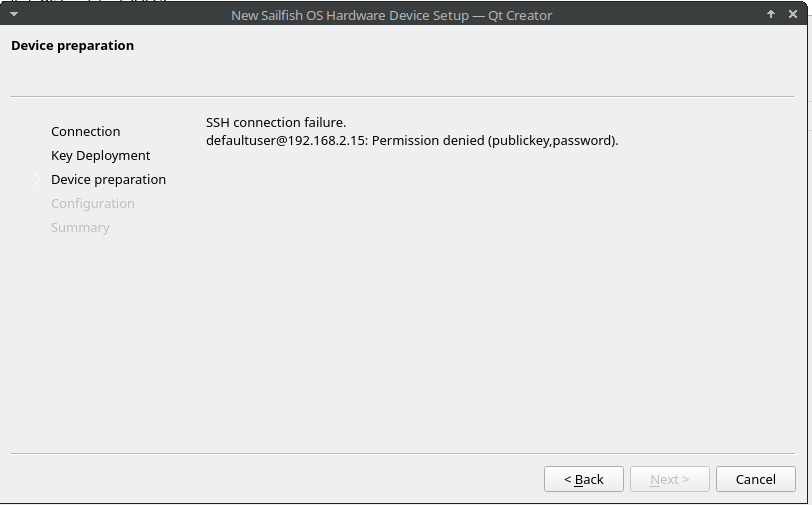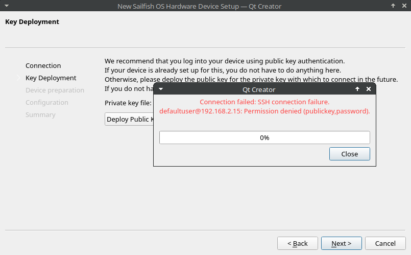 I am now on the point, that the Sailfish SDK is installed (MX Linux, debian based with offitial debian kernel). Example APPS are working now in the emulator mode. Now I am trying to setup the USB connection in development mode, but this is not working. Here is the HowTo: Your First App | Sailfish OS Documentation . If I folow all the stepps, in the wizard I have no connection to the phone with error:
