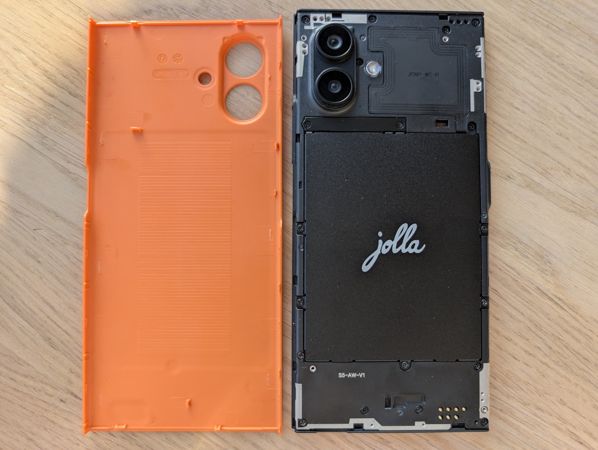 Popping off the back is easier than on the original Jolla Phone. There’s a small indent in the half that gives you something to pry against, and the tabs that hold it in place don’t feel fragile.