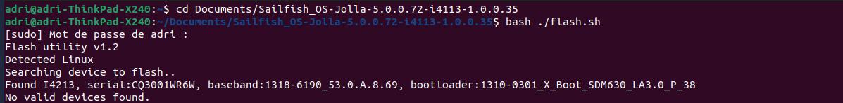 Finally, when I plugged the phone (with the blue light activated) and wrote the formula to flash Sailfish X in the Terminal, it didn’t work (picture 3).