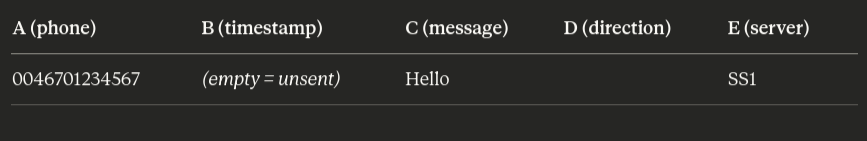 Where if you write in an SMS in C, and put a phone number in A, it will send that and then add the timestamp to B.
