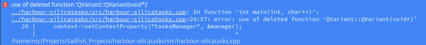 QQmlContext::setContextProperty() can take either pointer to QObject or a reference to QVariant. Maybe you were trying to give it the former, but perhaps TasksManager does not inherit QObject? The compiler thought that perhaps you were aiming for the second option, and tries to convert TasksManager pointer to QVariant by first converting it to void pointer and then giving it to QVariant(void *) constructor - which has been deleted. Deleted in this context has nothing to do with memory management, it really means that you are not supposed to call that constructor.