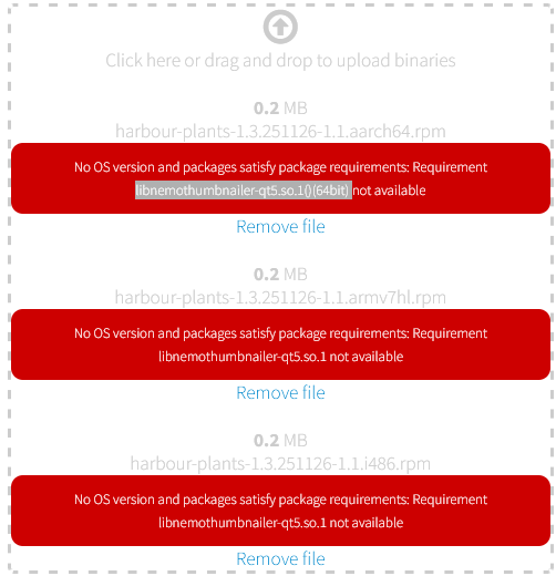 When I upload my binary file to Jolla Harbour, I get an error: ‘No OS version and packages satisfy package requirements:’. This is the exact and complete error message, and it stops after ‘satisfy package requirements:’. What can i do with it ?
