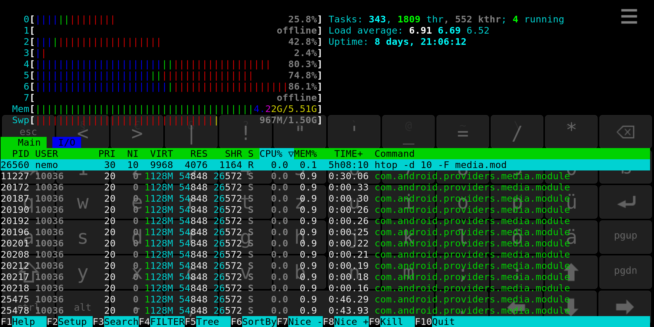 16:03:26 up 8 days, 21:00, 0 users, load average: 6.62, 6.20, 6.35