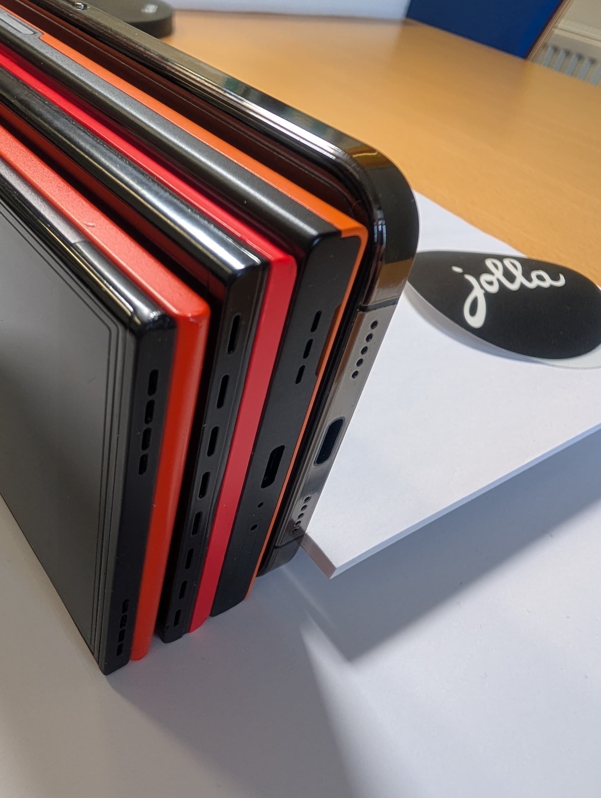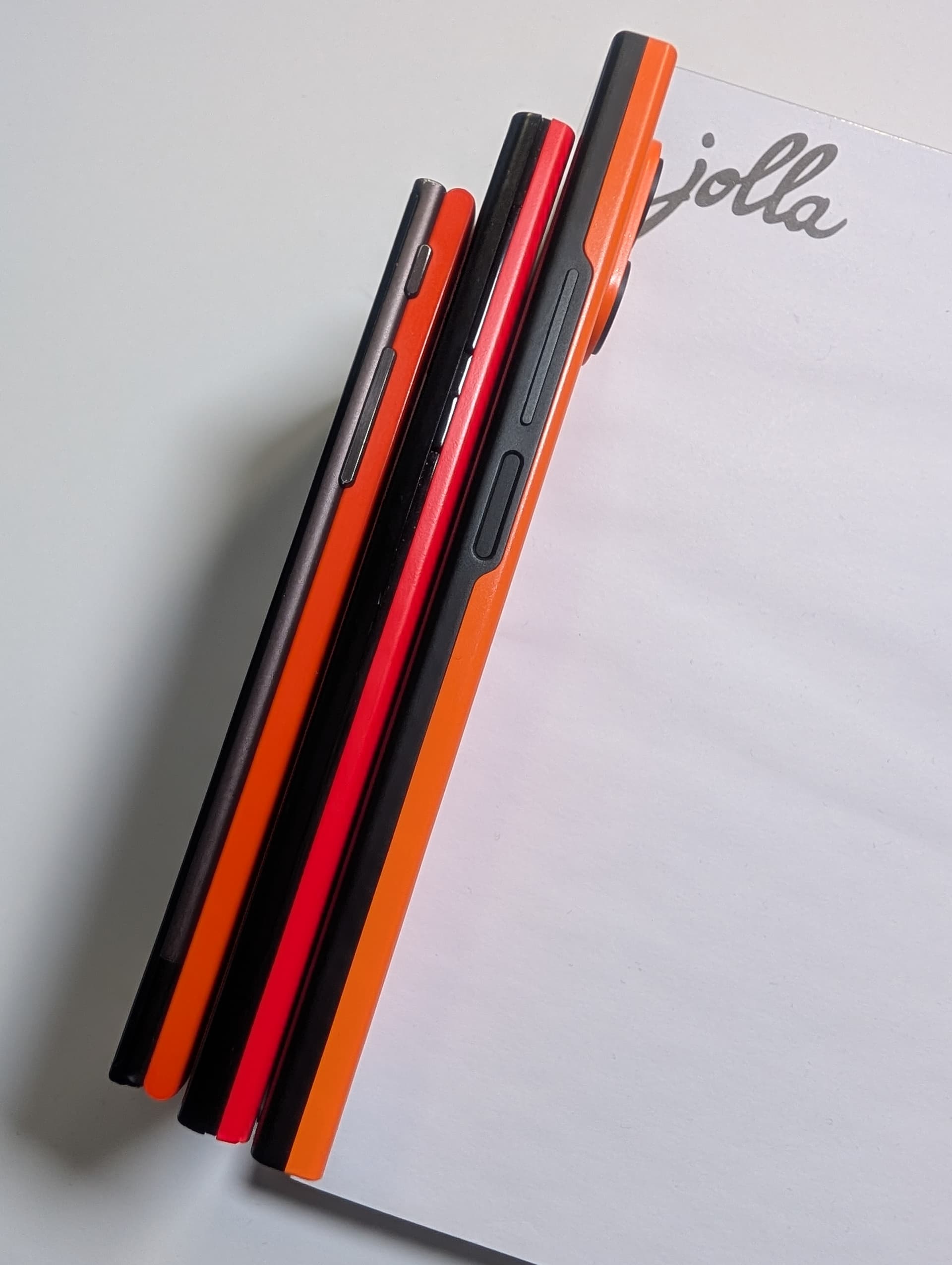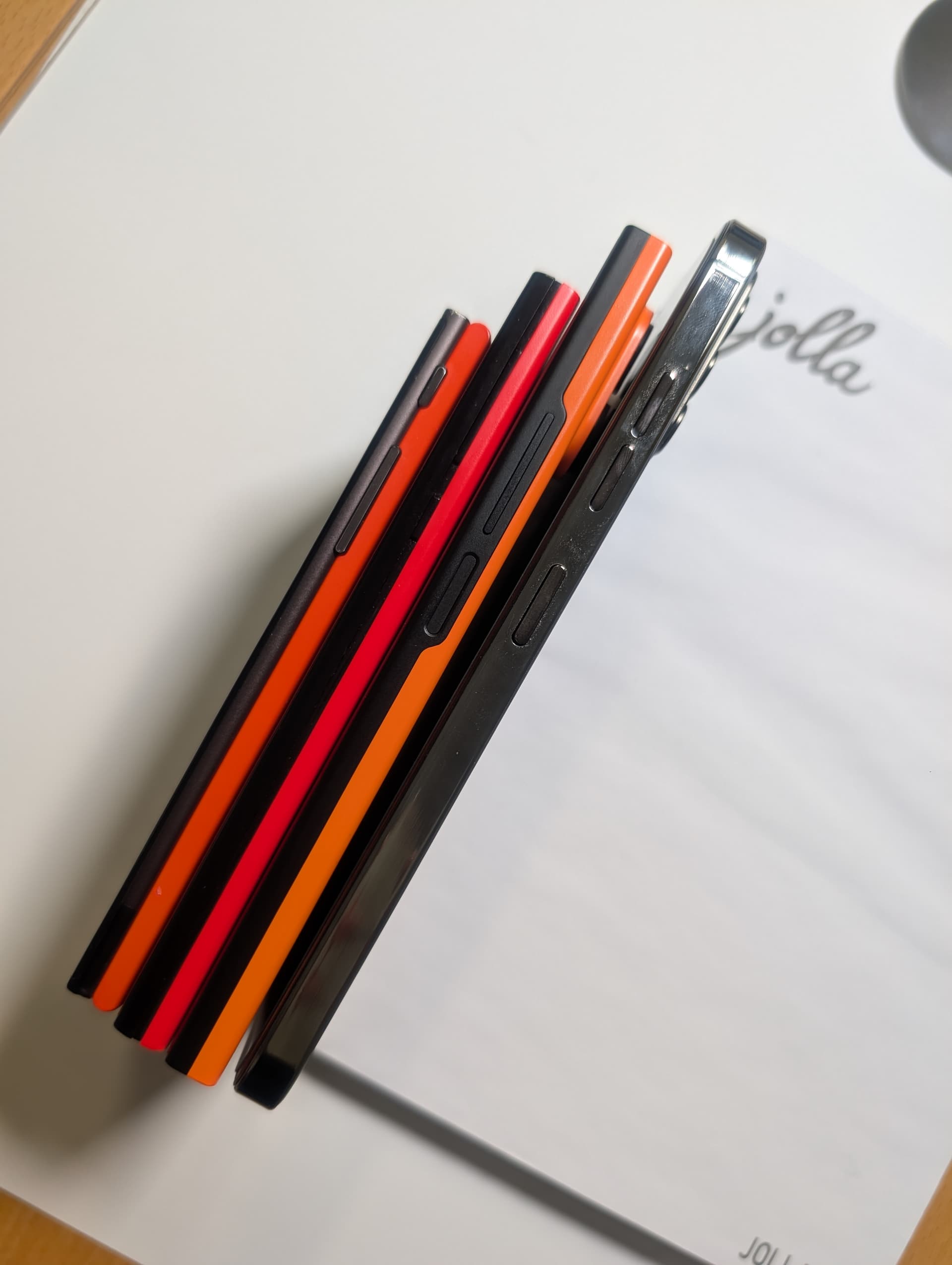 The bottoms of the phones are lined up as much as I can - because of the difference in widths (which is the “height” when standing on their sides), they look uneven from the top (the photos with the Jolla notepad). But when I change the angle you can see they are actually lined up (without adjusting the devices).
