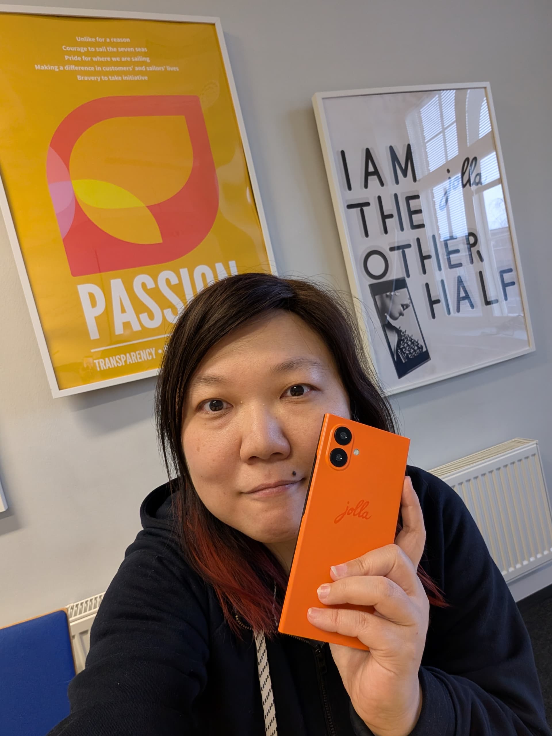 I love the return of the signature Jolla logo on the top of the phone! It’s a subtle, but still significant, part of the design and branding. Colours are very subjective. I do like the original “Poppy red” on the J1 best, but the current J2 orange does look classy and I will be happy to sport it. Speaking of which, I had to take some selfies with it.