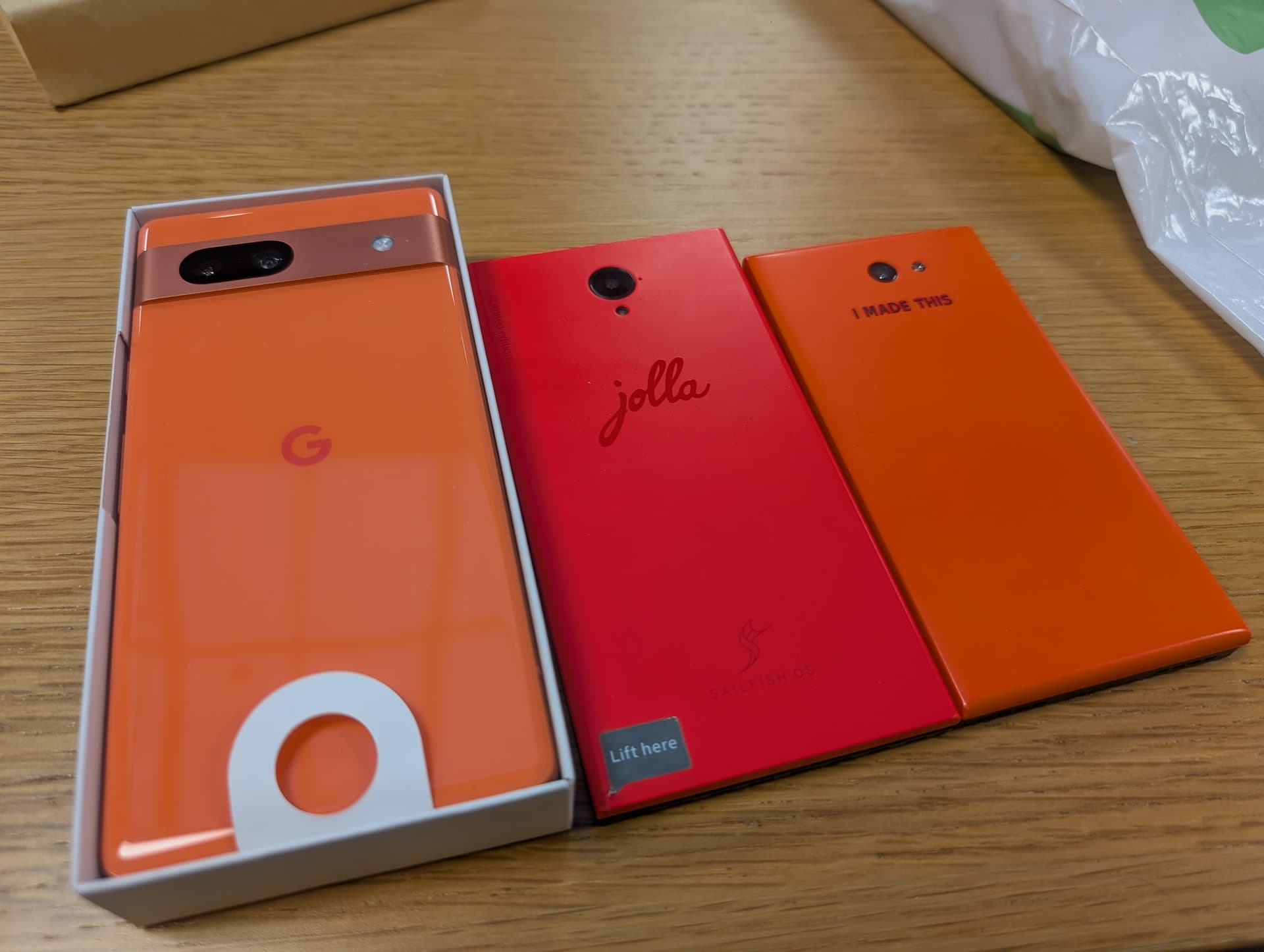 After I bid farewell to Raine, Sami, and other Jolla Sailors in the office, I met up with someone to sell my Pixel 7a. I was initially planning to put /e/ or grapheneos on it, but needed to make some room for the new Jolla Phone. I must have a thing for orange phones… well if only there were more decent purple devices, my collection would look quite different! In any case, I do see a 3D-printed purple back cover in my future.