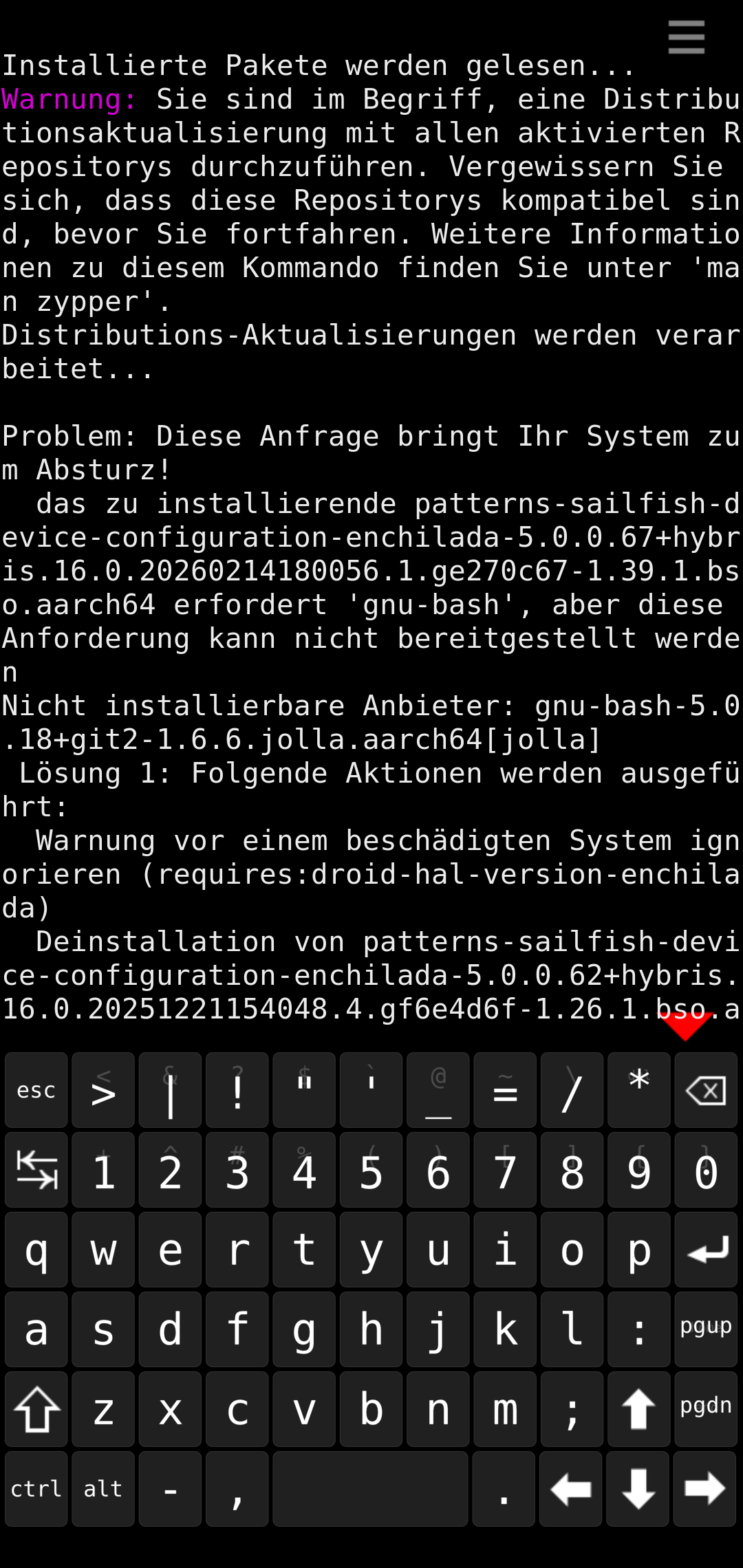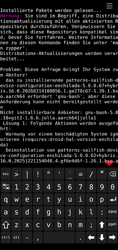 Hi, zypper ref, dup brings a warning “this could break your device” something with sailfish patterns??? I don’t understand. It gives me 4 or 5 possibilities to choose or to cancel. I canceled.
