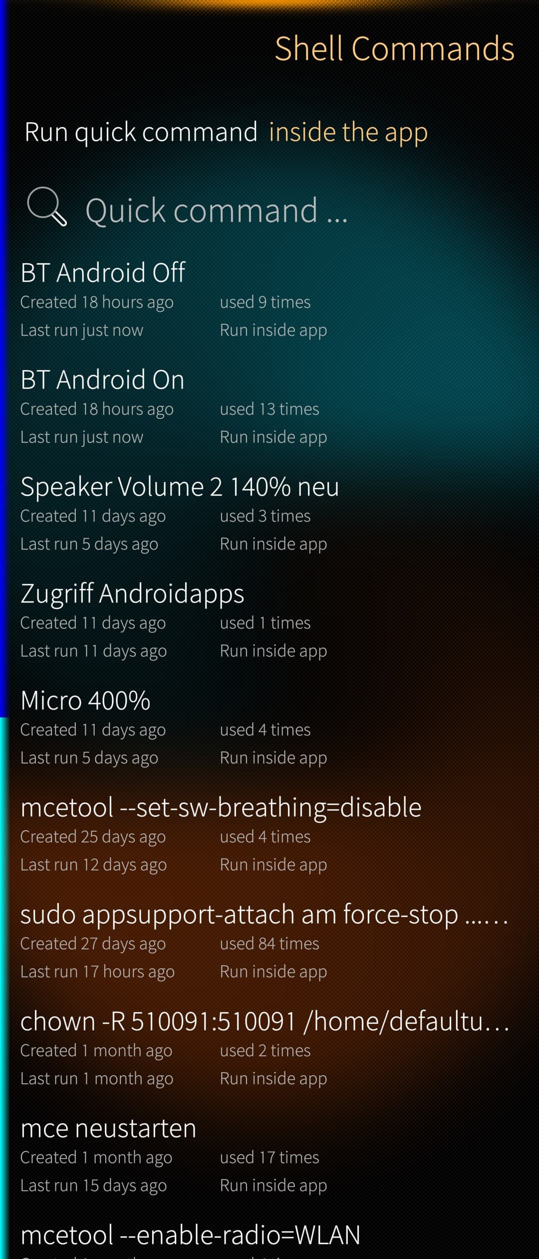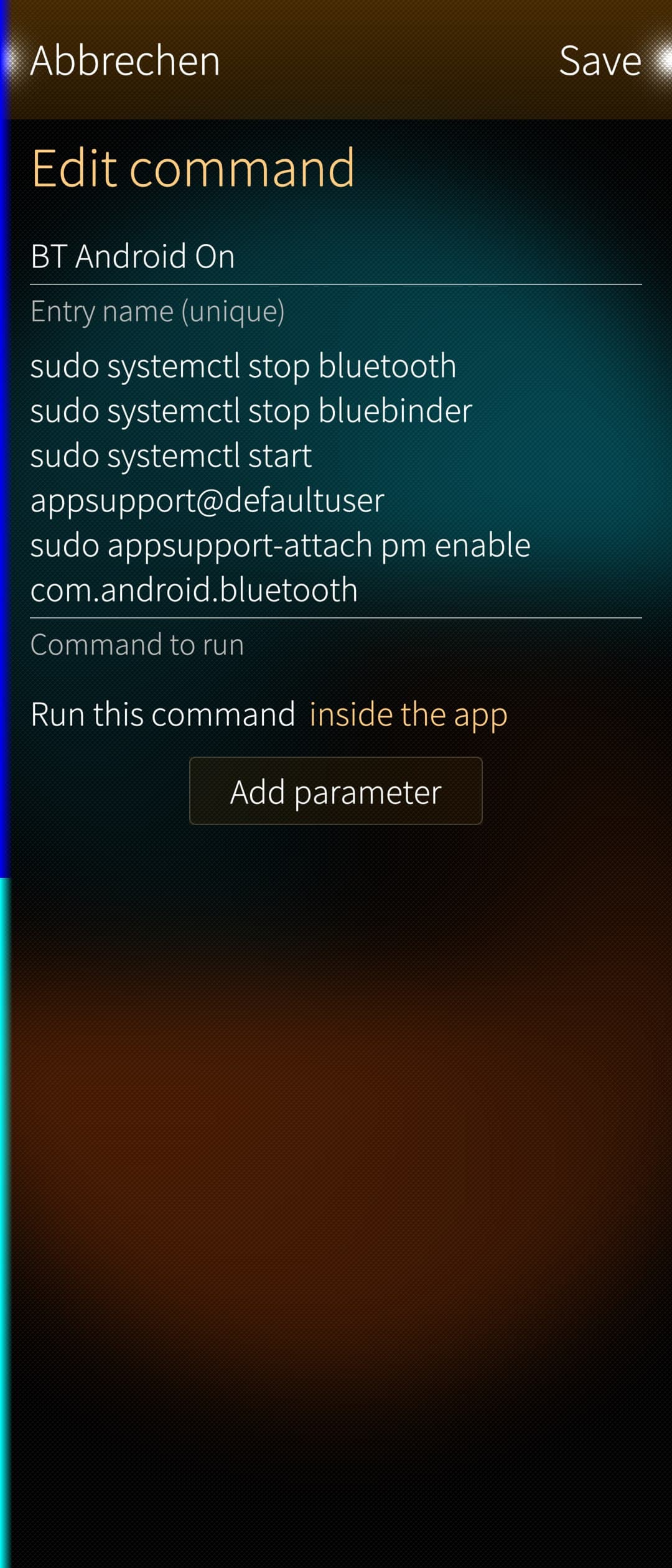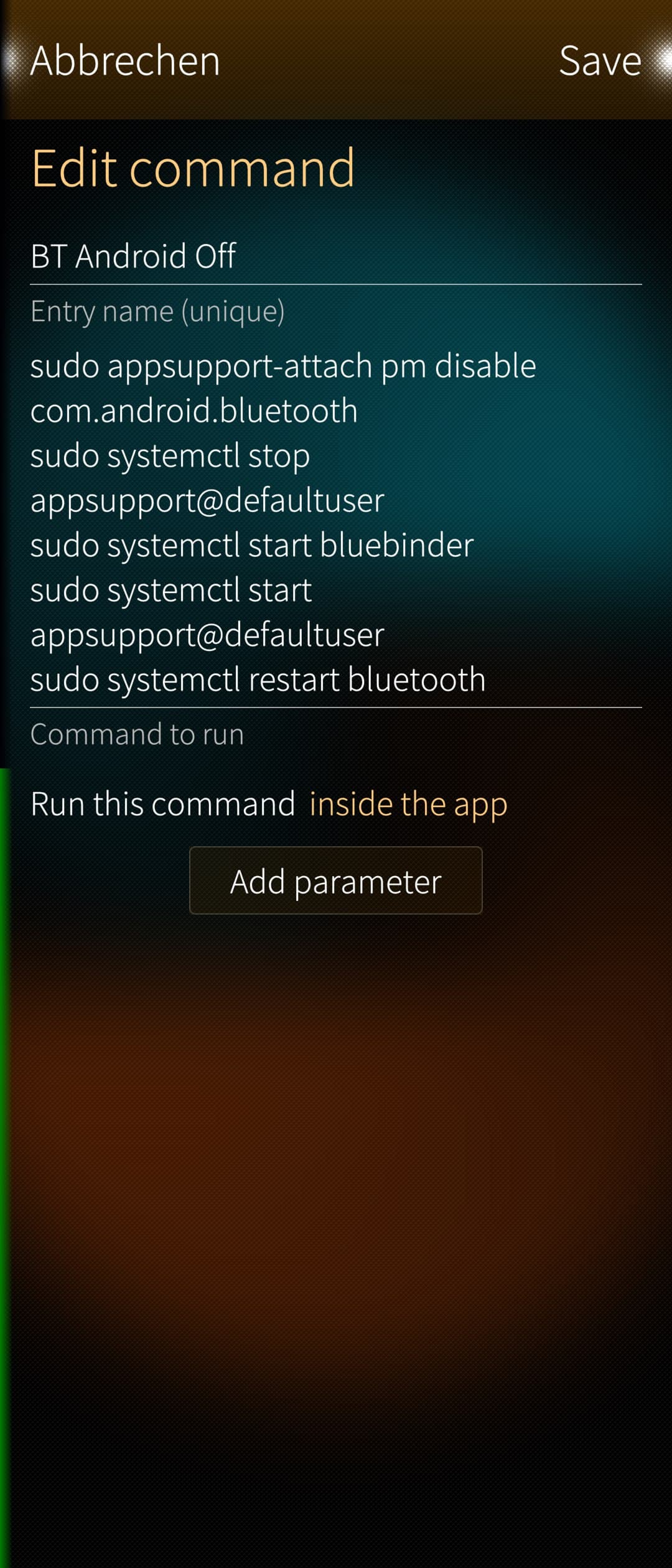 I’m a fan of ShellEx and Sudo. So I create in ShellEx two command blocks into one command. Of course, I modified the AAS file /opt/appsupport/etc/appsupport.conf.d/10-hybris.conf beforehand. I found out, this change can even remain permanent, because we can disable/enable the BT package from AAS.