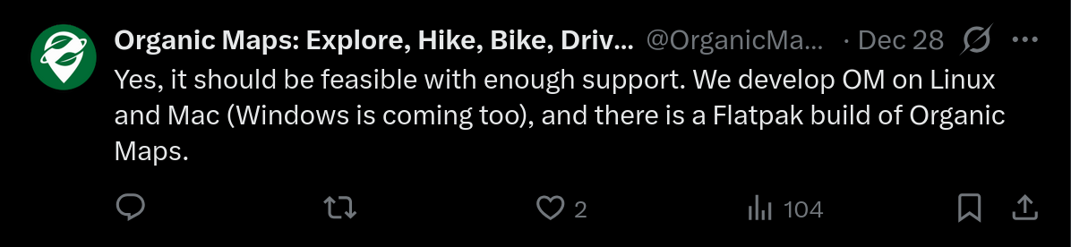 I’m worse than useless at that sort of thing. The question remains: if my future Jolla phone has an Android compatibility layer, is it even worthwhile porting? Android Organic Maps is an offline capable program, so security is less of concern. I’m trying to parse how feasible the compatibility layer really is. In my mind free software is free software. Organic Maps and OsmAnd~ for Android work really well (on Android). I understand the desire to create native software or adapt existing software but a primary marketing claim from Jolla is full Android app support. If I buy one of their phones will it fully replace my Android device? There is no way to know until it arrives. I exclusively use free software with no Google Play Service requirement.