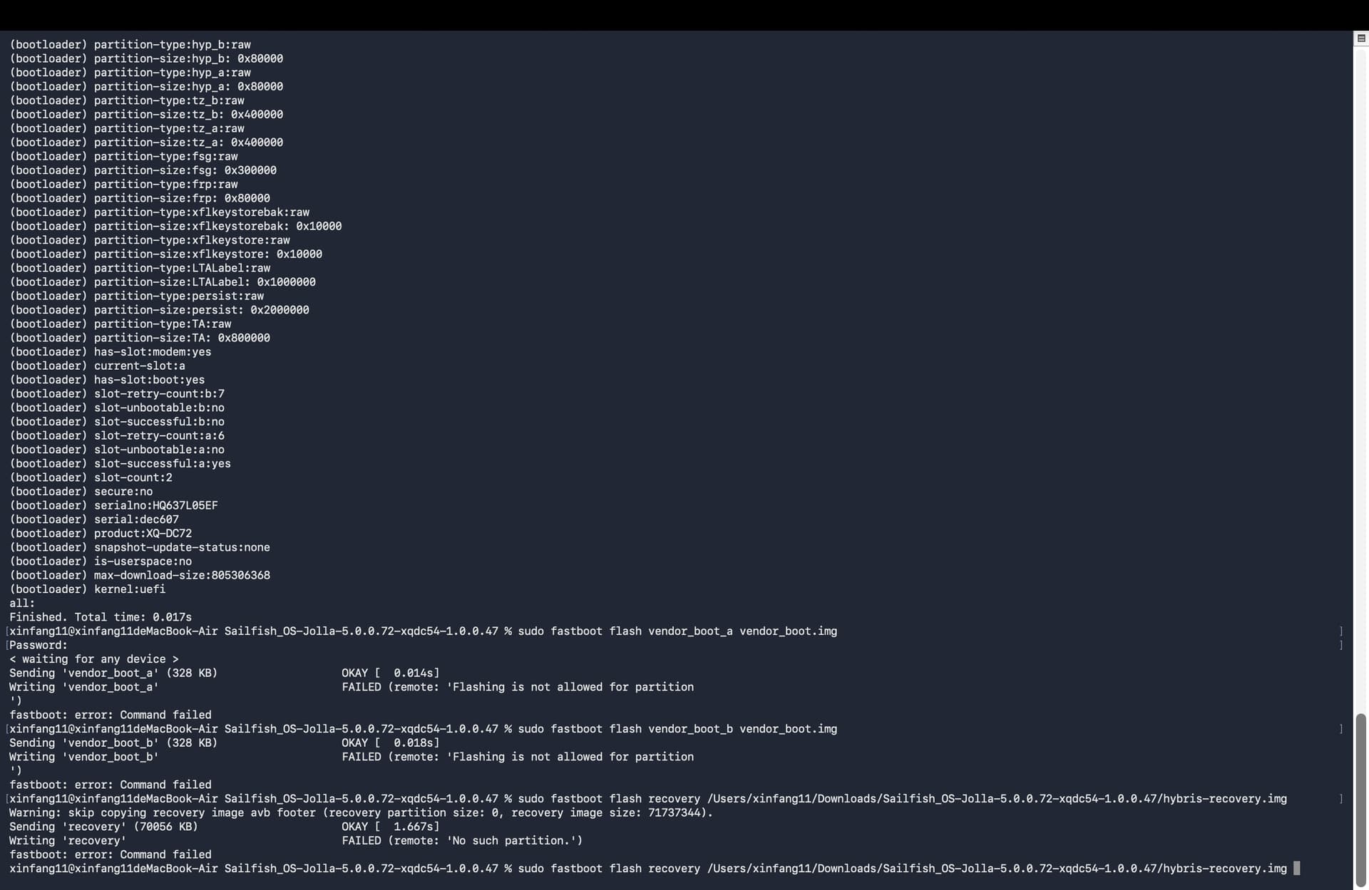 # fastboot -s XXXX flash userdata sailfish.img001
