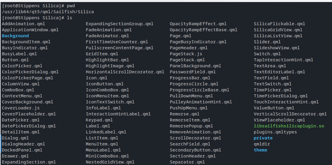 The screenshot shows the contents of /usr/lib64/qml/Sailfish/Silica.