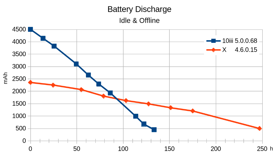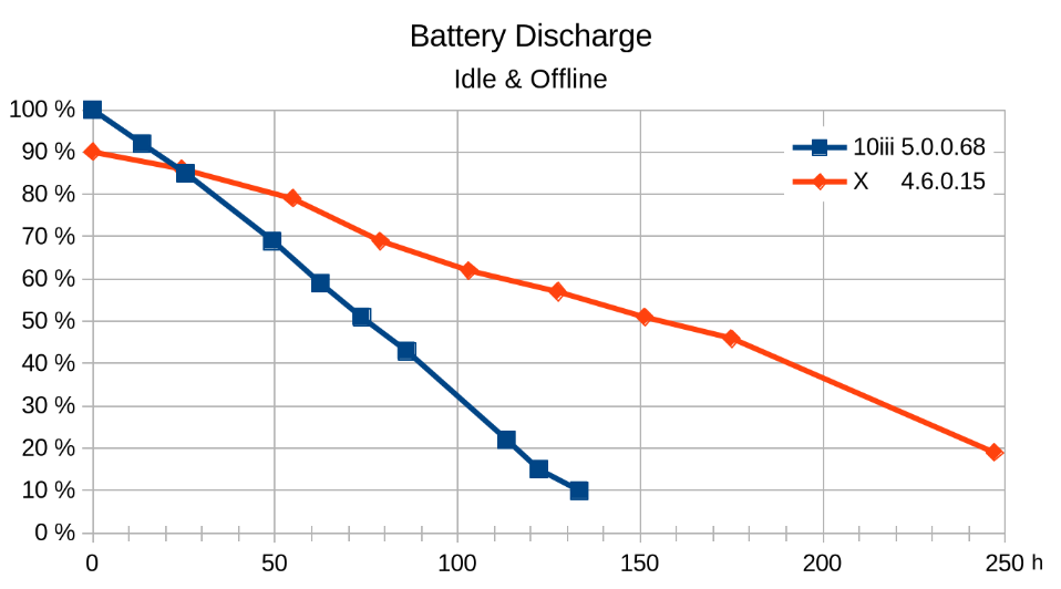 I recently had to start using my 10iii for mobile network reasons (LTE), but before putting it to use I checked its idle consumption. Test procedure: Charge device, reboot, leave it idle with all radios and GPS off, occasionally check battery level.