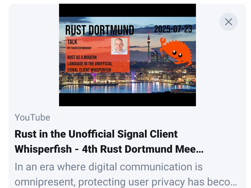 Hello WF enthusiasts. In July I gave a talk about “Rust in the Unofficial Signal Client Whisperfish”, which I didn’t want to withhold from you. I hope you like it. It has been publicly available on YouTube for a few days now: https://youtu.be/ek8HRN_d8Os?si=F9ll1xlOH2lZWLzk .