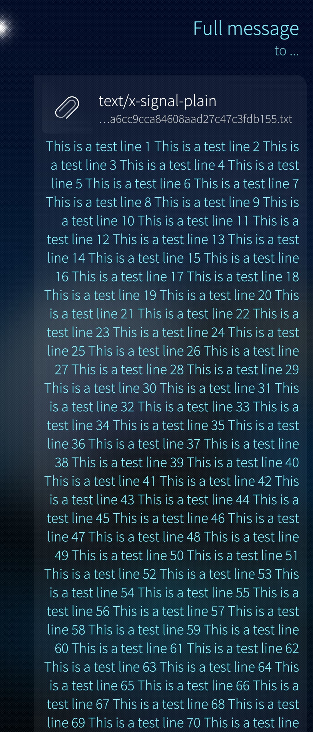Yep, that’s a good catch. I think this is evidence that Very long message contents should be pulled from attachment (#455) · Issues · Whisperfish / Whisperfish - Signal on Sailfish OS · GitLab is not yet implemented (I just found that issue)